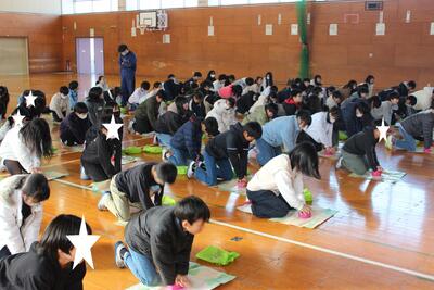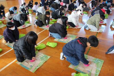 消防署の方にお越しいただき、救急救命法を学びました。人が倒れている現場に遭遇した際に、倒れている人を助ける処置ができるかの学習です。心臓突然死で亡くなる人が年間6~8万人と言われています。人に見立てたキットを使いながら、救命法を体験しました。