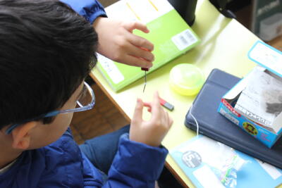 理科の授業です。磁石の性質をしらべる学習です。今日は磁石にいろいろくっつけてみて、磁石というものを自由に感じる時間でした。
