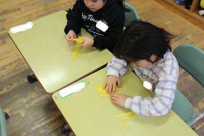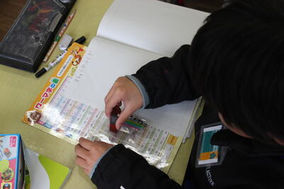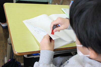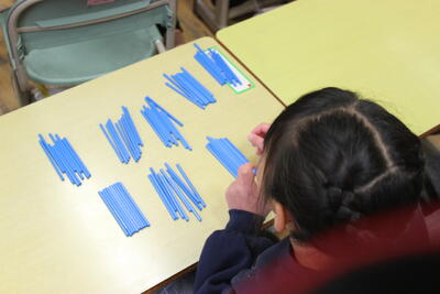 算数の授業です。100までの数や100を少し超える数を学習します。数え棒で10のまとまりを作って、先生が出題した数を集めます。数え棒も2本ずつ数え、できるだけ早く10のまとまりを作っていき、指定された数の本数を集めていきます。
