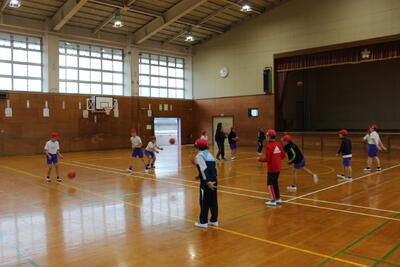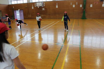 体育の学習です。ポートボールに取り組みます。まずはスロー&キャッチの基礎練習からです。相手の取りやすい所に投げて、来たボールをしっかり受け取ります。