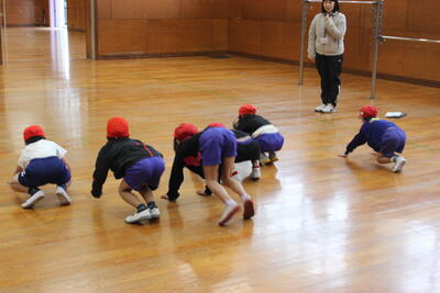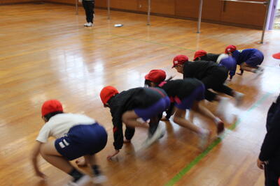 体育の授業です。とび箱遊びに取り組みます。まずは腕支持や地面をしっかり蹴るための基礎練習からです。写真は、うさぎ跳びの場面です。