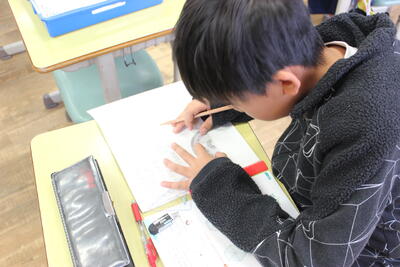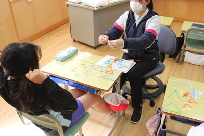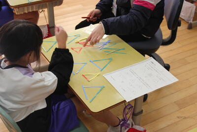 算数の学習です。三角形の性質を辺の長さに着目して、具体的な操作をしながら考えていきます。算数において、具体的な操作を通して身に付けていく過程が大切です。