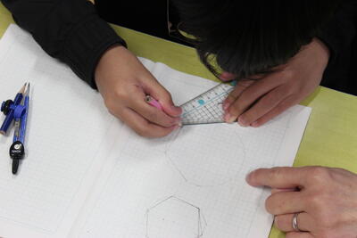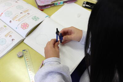 算数の授業です。円をもとにコンパスや分度器を使って正多角形を作図します。道具をどのように使えば、作図ができるか、また正多角形を組み合わせた複雑な図形が描けるか、頭の使いどころです。