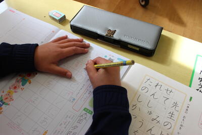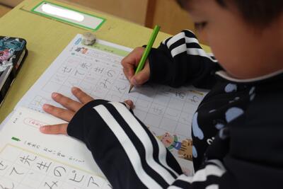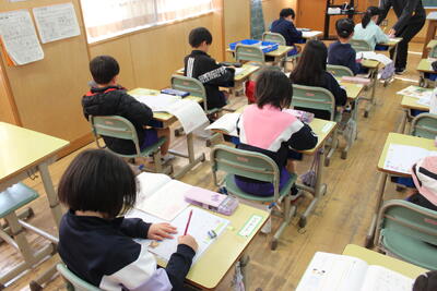 書写の学習です。最近、正しく鉛筆を持てない児童が増えています。1年生の書写では、特によい姿勢で鉛筆を正しく持って、美しい字を書くことを大切に指導しています。みんな真剣に良い字を書こうと頑張っていました。