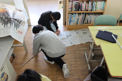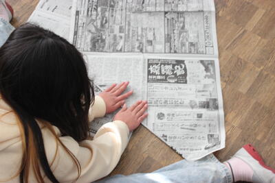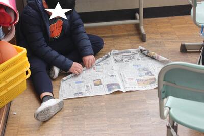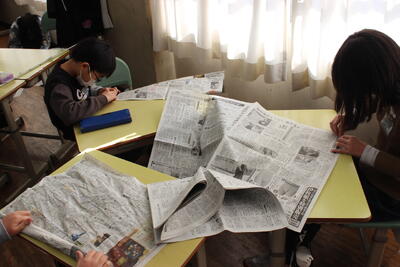 図工の学習です。新聞紙をできるだけ細く丸めていき、棒を作ります。たくさんできた棒を組み合わせて、自分のイメージしたものを作っていきます。明日の参観日にその様子を見てもらいます。