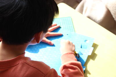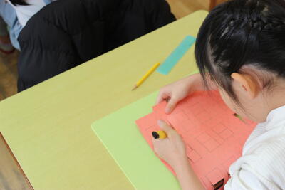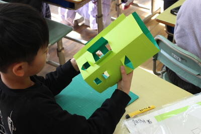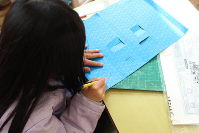 図工の学習です。台紙に四角や丸の形をくりぬきます。その後セロハンを張って素敵な窓のある建物を作っていきます。くりぬくのはカッターを使います。手を切らないように慎重に作業を進めています。