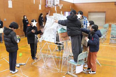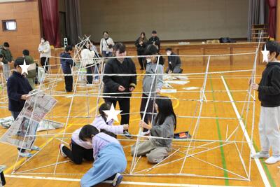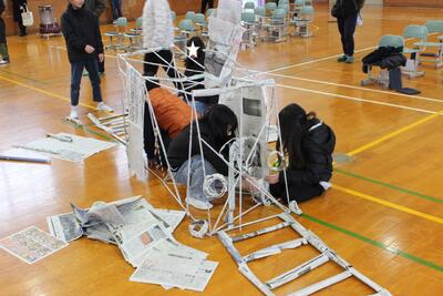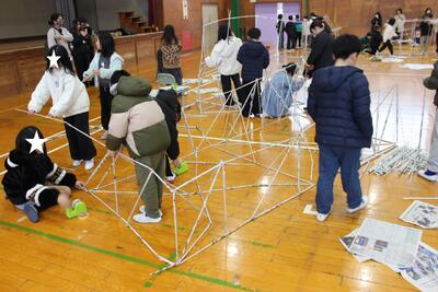 図工の時間です。昨日から準備した新聞紙を丸めた棒を組み合わせて、巨大立体模型を作りました。家があり、電車もあり、それぞれのグループの楽しい発想で、一本一本の棒を組合せ、すごい模型がたくさん出来上がりました。