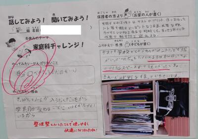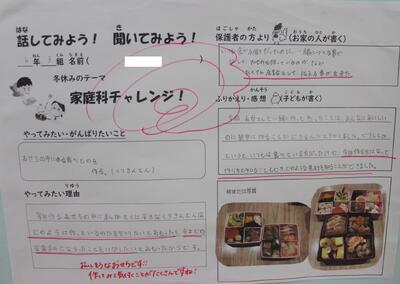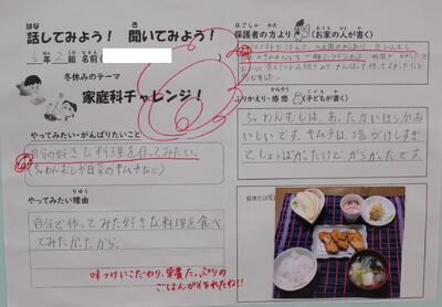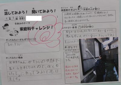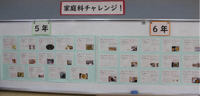 5・6年生が夏休みに取り組んだ「家庭科チャレンジ」を多目的ホールに掲示しています。5年生は、家庭でのクリーン作戦の様子、6年生は食事作りについてまとめたものです。みんなしっかり取り組めました。
