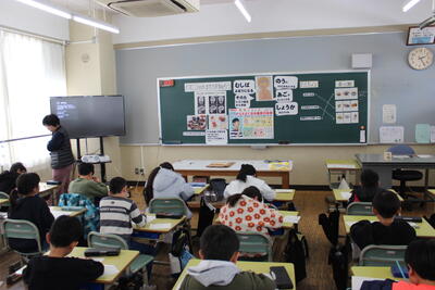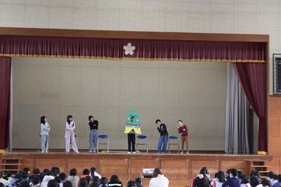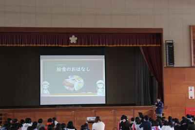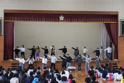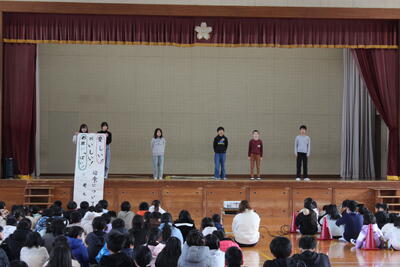 全校集会を開催しました。児童会本部、表現委員会、給食委員会からの発表でした。まずは全校合唱「ありがとうの花」を歌い、表現委員会のダンスで体も気持ちもほぐして始まりました。次に給食週間に関係する内容のお話が、教頭先生、児童会本部、給食委員会それぞれからありました。寒い中でしたが、全校が集まっても静かに集中して集会に臨める新舞鶴っ子のよさが見られる集会となりました。
