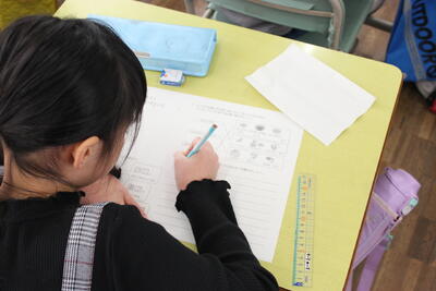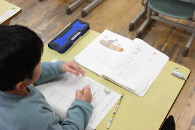 国語の学習です。説明的文章「アリの行列」の読み取りです。各段落の中心文を、その根拠を大切にしながら見つけていきます。まずは自分の力で読み取ります。ポイントとなる文や言葉に線を引きながら、自分なりの考えを作っていきます。