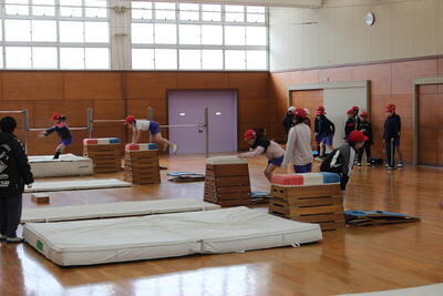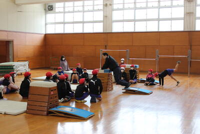 体育の授業です。とび箱運動の学習を進めています。高学年になり、技の難易度も上がっています。先生から技を美しく完成させるためのコツを聞きながら、一生懸命練習に打ち込みました。