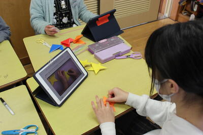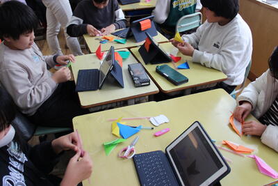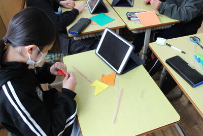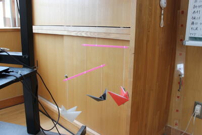 理科の学習です。てこの学習のまとめとして、モビールづくりに取り組みました。折り紙でおもりを作り、重心の位置を確認しながら素敵なモビールが完成しました。