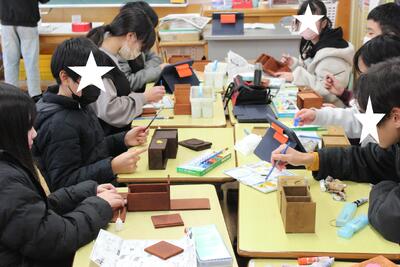 図工の学習です。6年生の卒業記念制作「オルゴール箱」の制作の大詰めです。彫った模様に色を着け、組み立てていきます。世界に一つのオリジナルオルゴール箱です。