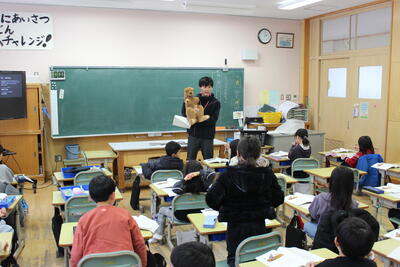 国語の学習です。説明的な文章「どうぶつの赤ちゃん」の学習です。今日はカンガルーの赤ちゃんについて読み取っていきました。ぬいぐるみで実際のカンガルーをイメージしながら、その特徴を読み取り、ワークシートに書き込んでいきました。