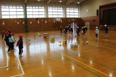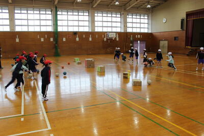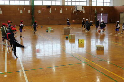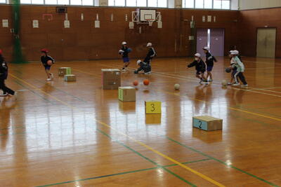 体育の授業です。真ん中に置いたいろいろな大きさの箱の的を狙って蹴ります。的に当たっただけでは得点にはなりません。的に当たって的が動くと得点です。大きい的は当てやすいけれど重くてなかなか動きません。どれを狙ってどれぐらいの強さで蹴ればよいのか、なかなか頭も使うゲームに挑戦です。